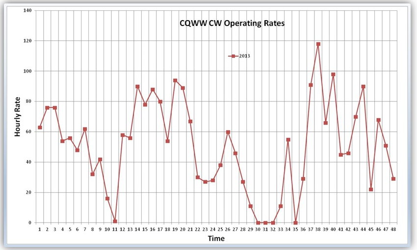 For the first time in my CQWW history, I secured a frequency on 40m and started calling CQ approximately ten minutes before the beginning of the contest. The lower you are in the 40m band, the more essential it is to do this if you are to have a hope of securing a "run" frequency at the beginning of the contest. I ran 40m for the next 2 ½ hours before passing through 160m to catch 5 new ones. I then spent the next 2 ½ hours on 80m. The "mega-stations", with their multiple antennas, have not only "antenna agility" with multiple antennas on each frequency band, but also the inherent ability to keep their frequencies clear. For example, splitting your RF power in half to one antenna at 100 ft on Europe, and the other antenna pointed at South America at 60 ft, not only increases coverage but helps keep frequency encroachers away. A clear frequency comes at the small price of 3 dB in signal strength. With a single tower and primarily one antenna per frequency band, I am at a disadvantage. In my case I did alternate between vertical and low inverted-Vee on 80 m and my 40m yagi and vertical to attempt to keep the frequency more clear. I believe this tactic helped, although with some of the European "big guns" on 40m, multiple yagis were really needed. A new experience for me occurred Saturday morning on 20m. I was able to work JAs going the normal way over Alaska as well as passing over Europe. I found that quite interesting. Band conditions for the contest were very favorable, although they had been hotter the weekend before. During the daylight hours I alternated largely between 10m and 15m, but did spend considerable time mid-afternoon Saturday and Sunday on 20m as well. It was disappointing to hear so few stations from South America. This year, as was the case last year, I struggled to get different countries on the six bands for multipliers. I would routinely do "search and pounce" when I would do a band change before finding a clear frequency to "run". My reasoning was that the rare ones were not going to come to me; it was up to me to find them. I operated "Non-Assisted", which means no spotting aids from the internet. I spent considerable time Sunday afternoon looking for new zones and countries which, obviously, diminishes one’s run rate. The accompanying graph (above) shows my rates over the contest period. I am still in the process of analyzing this data with a) the times I did band changes and b) those periods of time when I picked up good numbers of new countries. At the end of this analysis I may decide I should not have changed bands quite as frequently. |